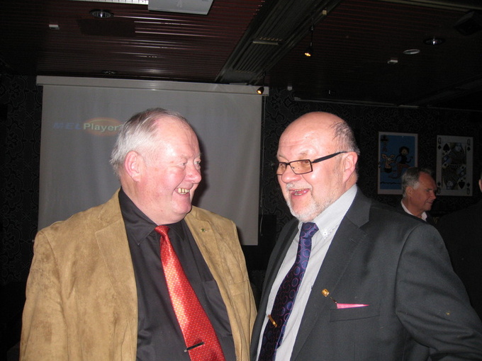 Entiset työkaverit Pertti Räsänen ja Juhani Kokkonen tapasivat myös pikkujoulun merkeissä monien muidenkin työkavereiden kanssa.